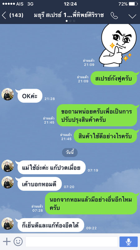 - ใช้ง่ายไม่หกเลอะมือเนื่องจากเป็นหัวสเปรย์ ตัวยาสามารถพ่นกระจายตัวไปตามผิวหนังได้ทั่วดีกว่าน้ำมันหกเลอะเปลืองกว่า